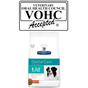 Depending on the size of your puppy, smaller breed dogs are now ready to transition from puppy food to adult food. However medium-to-large sized breeds that are still growing, may benefit from staying on their puppy food for a little longer until 1 year of age or older. Always check with your vet to see when is the best time to transition your puppy onto an adult diet. If your puppy is ready for adult food and they have no existing conditions that restrict their diet, at My Vet Animal Hospital, we recommend Hill’s Prescription Diet t/d (dental care) Canine as they have the Veterinary Oral Health Council (VOHC) registered seal for controlling plaque and tartar on your puppy’s adult teeth.