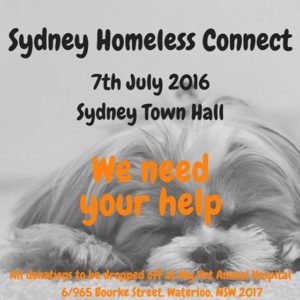 It is that time of year again! Here at My Vet Animal Hospital Waterloo we are looking forward to participating in the annual winter Sydney Homeless Connect event for our second year running! This event is held at Town Hall every year in order to support people who are homeless or at risk of becoming homeless to connect with service and care providers to help them move forward. The aim of this event is to not only raise awareness, but to improve the homeless person’s situation and ultimately find permanent accommodation for those in need. The event provides crisis care, financial and legal advice, employment information and housing assistance, as well as dental and medical attention, haircuts, massages and a hot meals! But who is there for there for the homeless pet population? Answer….as a community WE can be!